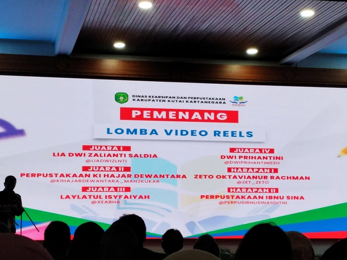 Kemudian, sebanya 6 orang peserta tingkat umum pada kategori lomba video reels Instagram (IG), yaitu Lia Dwi Zalianti Saldia akun IG @Liadwizlnti sebagai juara 1, Perpustakaan Ki Hajar Dewantara akun IG @kihajardewantara_man2kukar sebagai juara 2, Laylatul Isyfaiyah akun IG @xeabha juara 3, Dwi Prihantini akun IG @dwiprihantin0311 juara 4, Zeto Oktavianur Rachman akun IG @zet_zeto harapan 1 dan Perpustakaan Ibnu Sina akun IG @perpusibnusinasditni harapan 2.