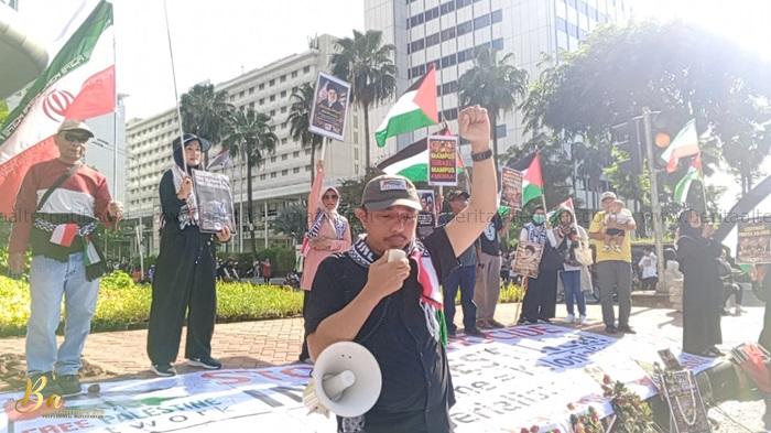 Tampak massa FPN membentangkan beberapa spanduk besar, masing-masing seukuran 6 meter. Pada spanduk pertama tertulis, “Israel Bunuh Prajurit TNI, Saatnya Indonesia Tegas!”