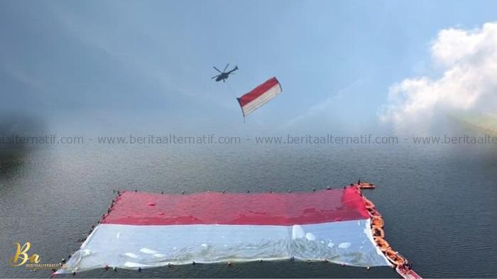 Bukan hanya oleh riuh tawa masyarakat yang berkumpul di tepian, tetapi juga oleh dua momen bersejarah yang menjadi sorotan helikopter yang mengibarkan bendera Merah Putih di udara dan pembentangan bendera raksasa di atas permukaan danau.