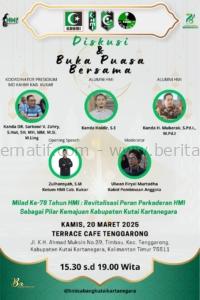 BERITAALTERNATIF.COM – Himpunan Mahasiswa Islam (HMI) Cabang Kutai Kartanegara (Kukar) akan menggelar Diskusi dan Buka Puasa Bersama dalam rangka Milad ke-78 HMI di Terrace Café Tenggarong pada Kamis (20/3/2025) pukul 15.30 Wita.