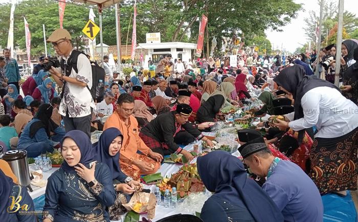 Ribuan masyarakat tumpah ruah menikmati santapan bersama Kesultanan Kutai Kartanegara Ing Martadipura hingga para pejabat pemerintah daerah di sepanjang Jalan Diponegoro Tenggarong pada Kamis (25/9/2025).