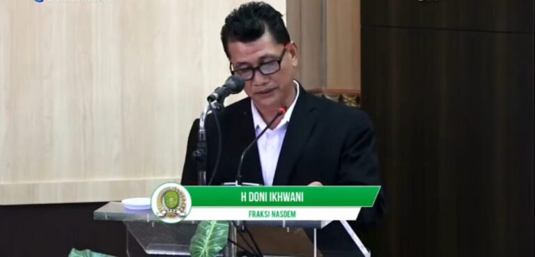 Kukar, beritaalternatif.com – Juru bicara Fraksi NasDem, Hanura, dan Perindo (NHP) H. Doni Ikhwani membacakan Pemandangan Umum Fraksi terhadap Nota Keuangan Rancangan Peraturan Daerah (Raperda) tentang Anggaran Pendapatan Belanja Daerah (APBD) Kutai Kartanegara (Kukar) Tahun Anggaran 2022 pada Rapat Paripurna ke-20 Masa Sidang 1 di Ruang Sidang Utama Dewan Perwakilan Rakyat Daerah (DPRD) Kukar, Kamis (25/11/2021) siang.